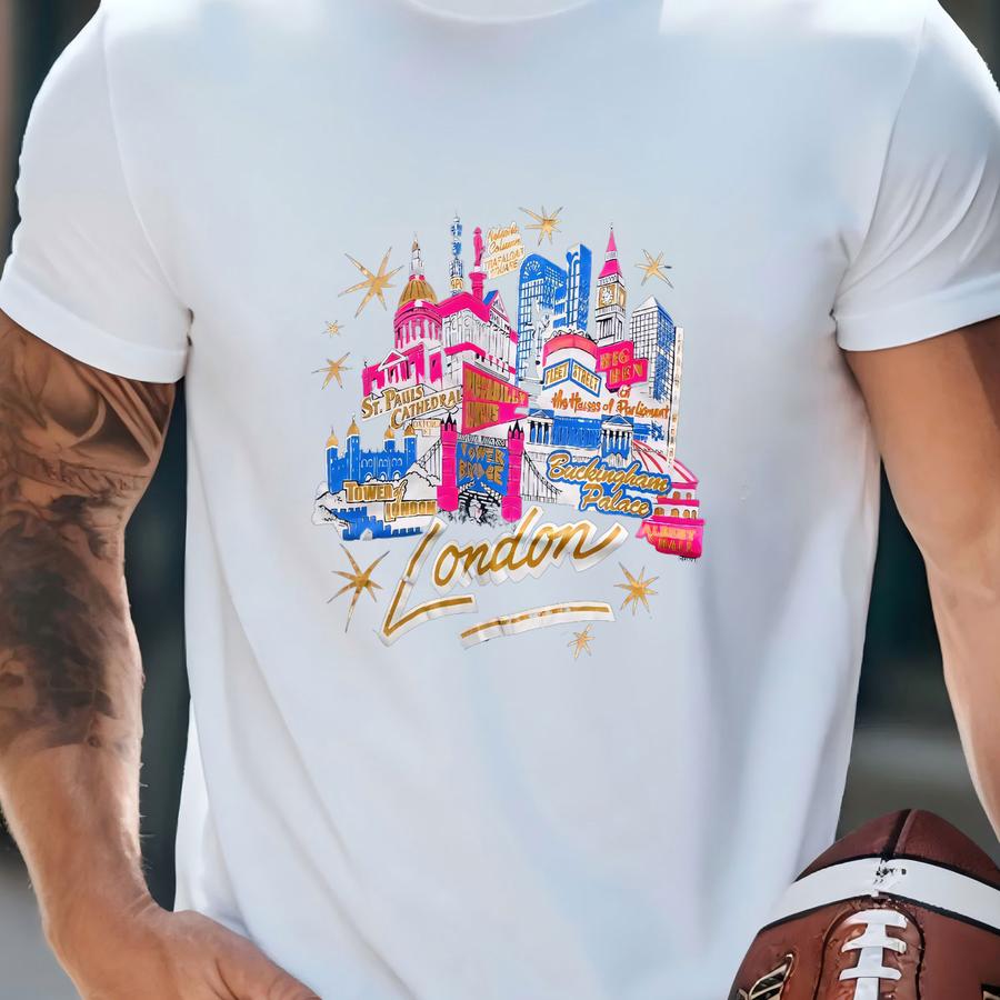 Vintage 1990s London City Neon Landmark Tee Retro Tourist Souvenir Big Ben Tower Bridge St Pauls Buckingham Palace Map Art Shirt Size S T-shirt