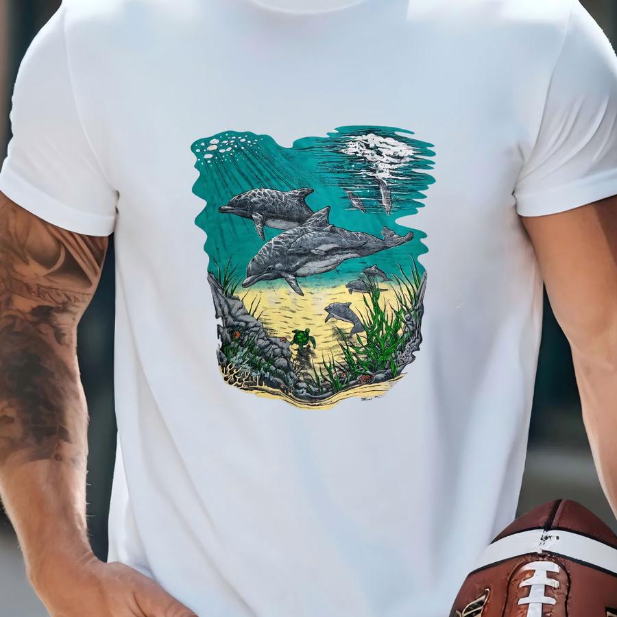 Vintage 90s Dolphin Ocean Sea Life Nature Art Mango Tree Underwater Scene Marine Wildlife Graphic Tee Retro Shirt Size L T-shirt