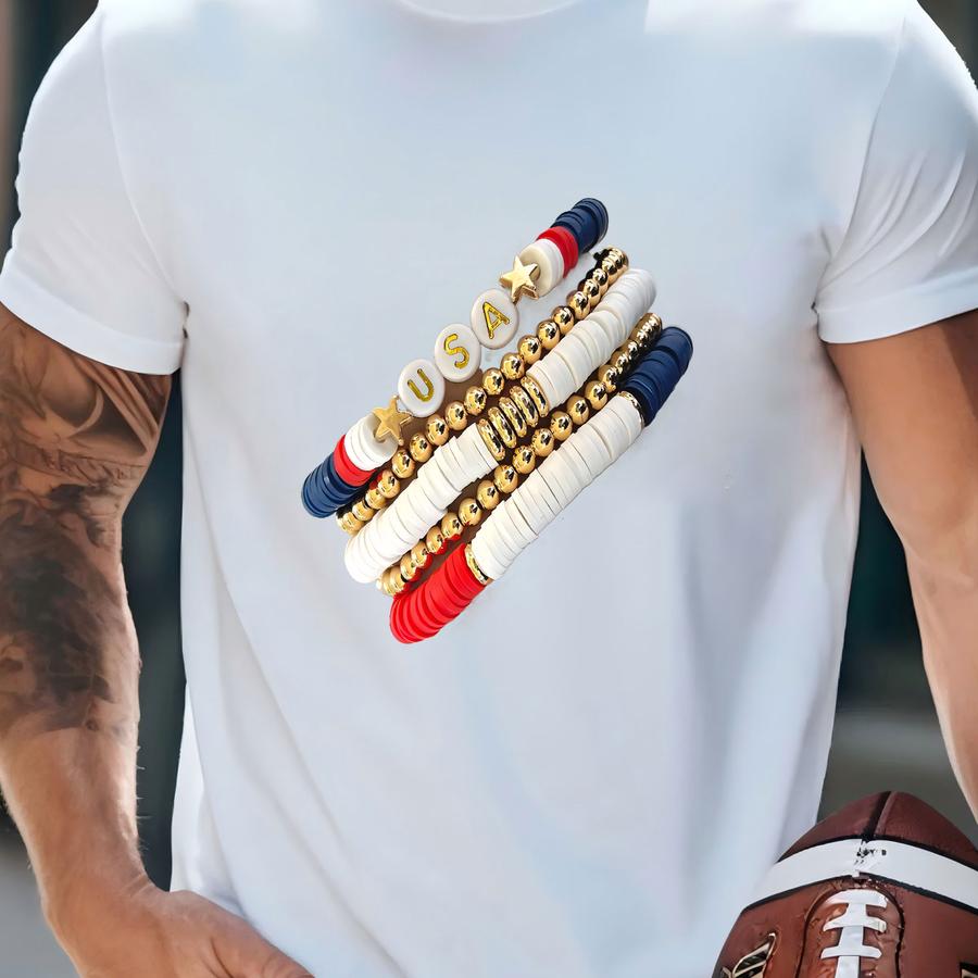 Usa Red White And Blue Bracelet, 4th Of July Jewelry, Patriotic Accessories, Heishi Stacking Summer Bracelets, Independence Day Jewelry T-shirt