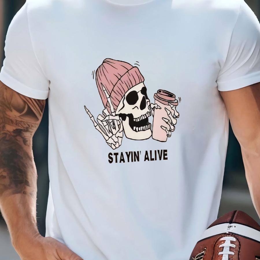 Stayin Alive Sweatshirt, Skeleton Coffee Crewneck, Halloween Sweatshirt, Funny Crewneck, Fall Sweatshirt, Frankenstein Portrait Shirt T-shirt