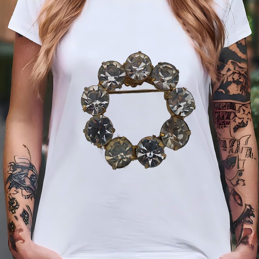 Vintage Gold Tone Round Brooch W/ Clear Rhinestones – 1 1/4” T-shirt