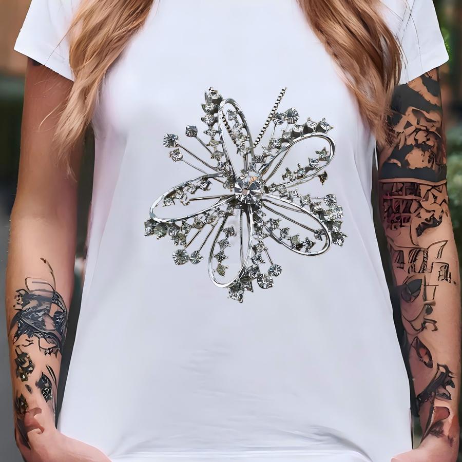 Estate Art Deco Silver Tone Rhinestone Flower Brooch Pendant Necklace T-shirt