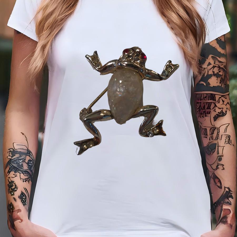 Vintage Gold Tone Frog Brooch Red Rhinestone Eyes Clear Rhinestones Faux Pearl Body T-shirt