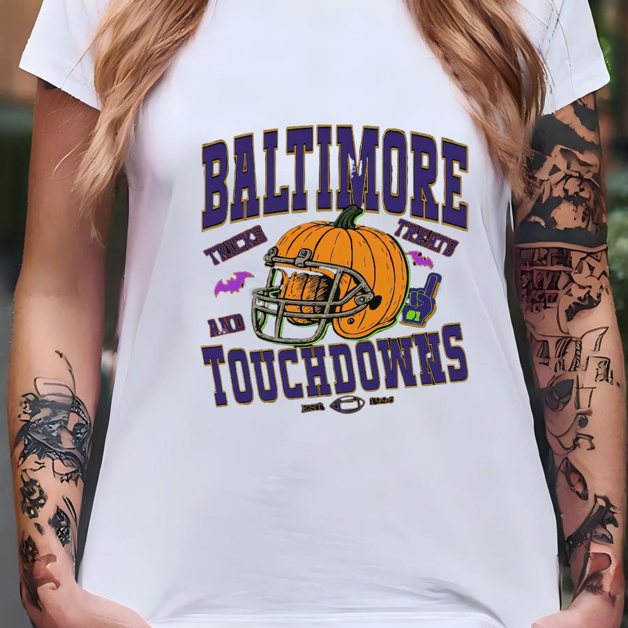Baltimore Football Halloween Shirt, Pumpkin Helmet Game Day Tee, Funny Tricks Treats And Touchdowns Hoodie, Vintage Baltimore Football Gift T-shirt