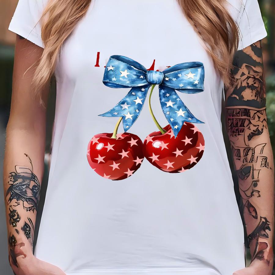 Cherry 4th Of July Tshirt, Patriotic Cherry Tee, Usa Star Shirt, Memorial Day Shirt, Independence Coquette Bow Day Tee T-shirt