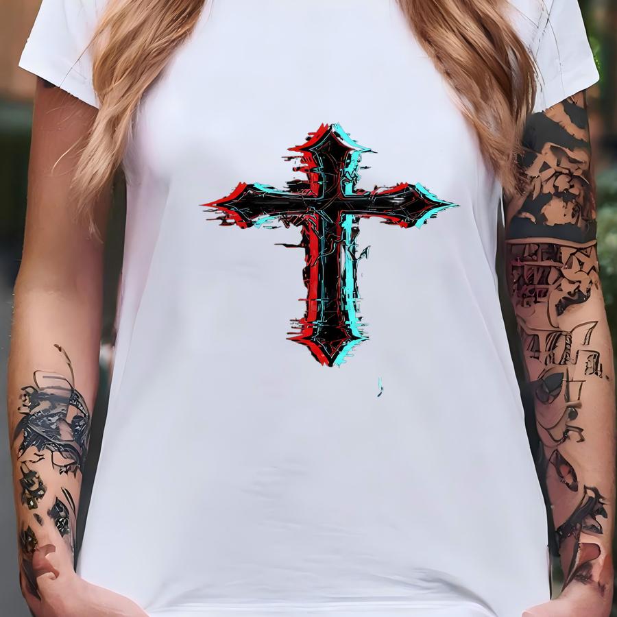 Broken Faith Sweatshirt, Gothic Cross Hoodie, Glitch Red Blue Cross Top, Spiritual Grunge Pullover, Cyber Cross Streetwear Gift T-shirt