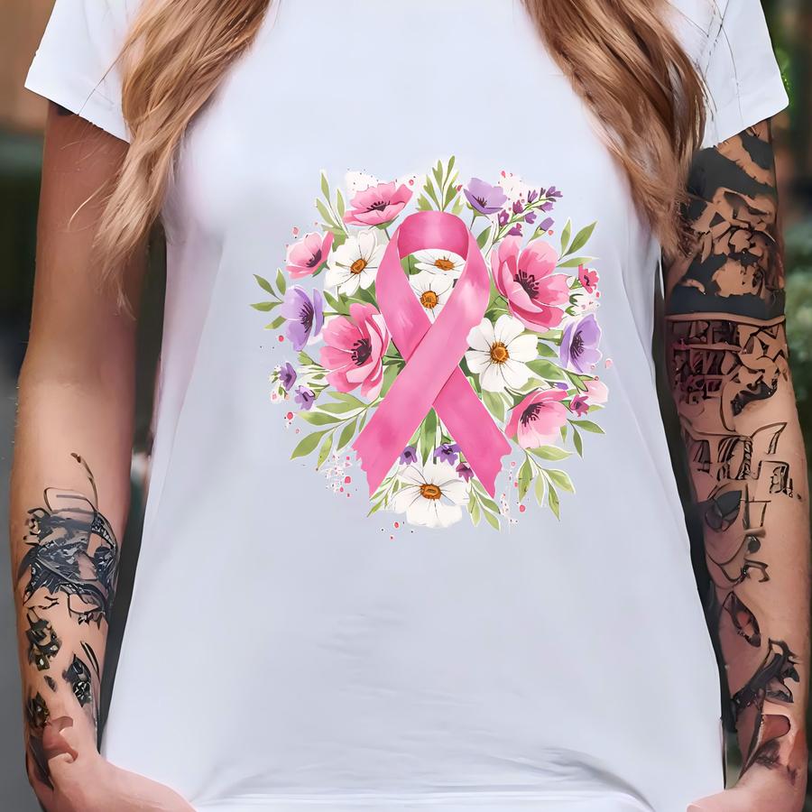 Floral Pink Ribbon Breast Cancer Awareness Tee, Breast Cancer Survivor Reusable Canvas Tote, Pink Ribbon Tote, Cancer Survivor Gift T-shirt