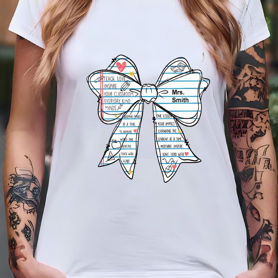 Custom Coquette Paper Teacher Bow Shirt, Teacher Coquette Bow Shirt, Back To School, Teacher Appreciation Gift, Custom Name Teacher Shirt T-shirt