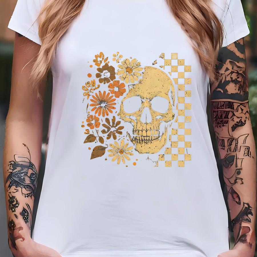 Vintage Skull Shirt With Flowers, Grunge Floral Halloween Tee, Checkerboard Skull Graphic Hoodie, Fall Skeleton Sweatshirt Aesthetic T-shirt
