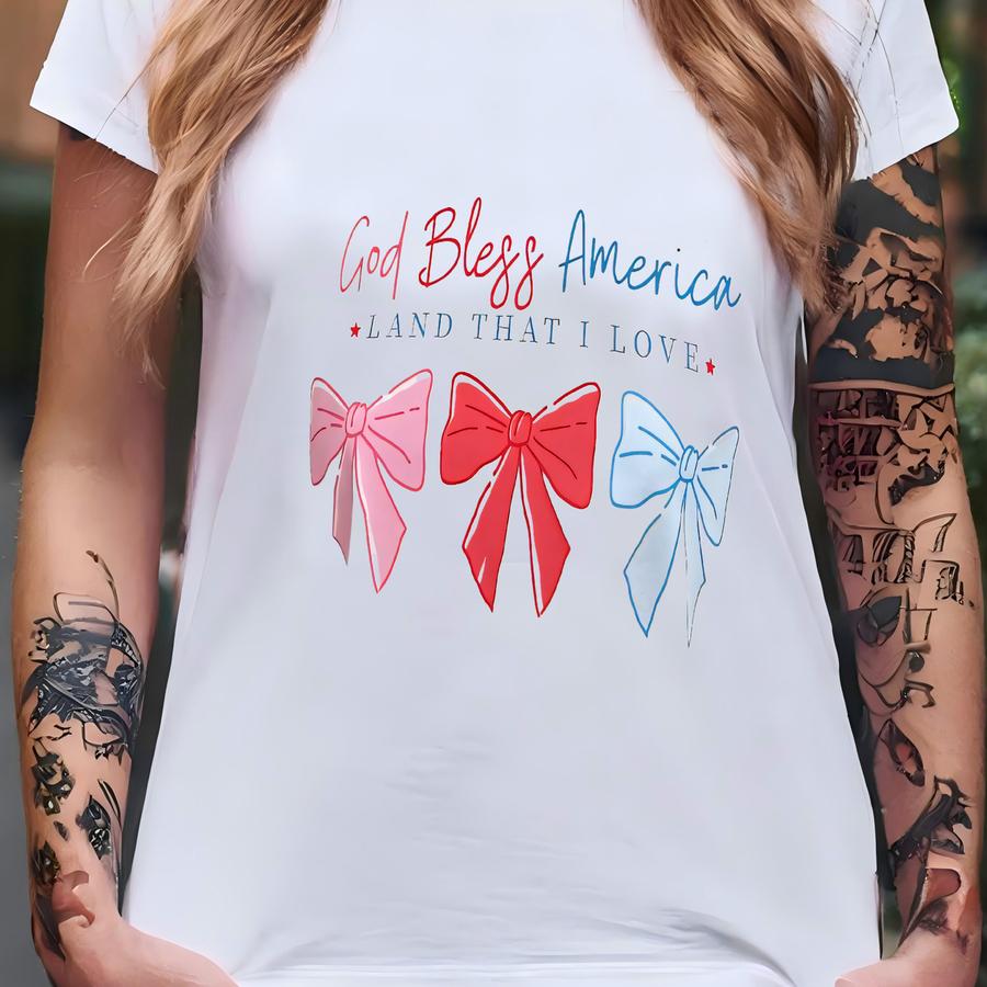 God Bless America, Land That I Love Coquette Bow Usa Hoodie, 4th Of July Girly Shirt, Summer Themed T-shirt