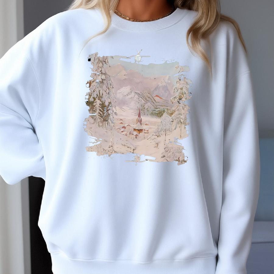 Retro Church In Snowy Mountains Scene Vintage Style, Christmas Apparel Sweatshirts Tshirt Sweatshirt