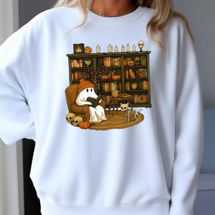 Retro Ghost Reading Book T-shirt: Halloween Librarian Teacher Tee S-3xl Sweatshirt