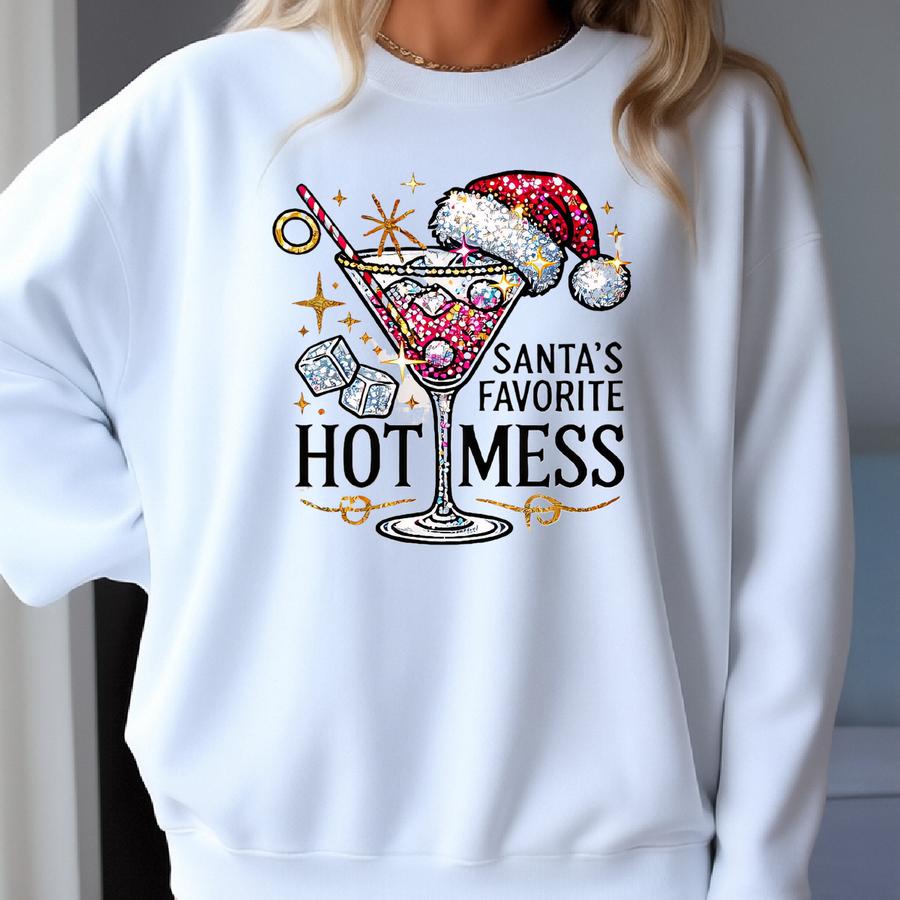 Santa’s Favorite Hot Mess Shirt, Funny Christmas Cocktail Tee, Holiday Party T Shirt, Sparkle Xmas Outfit, Festive Drinking Sweatshirt Sweatshirt