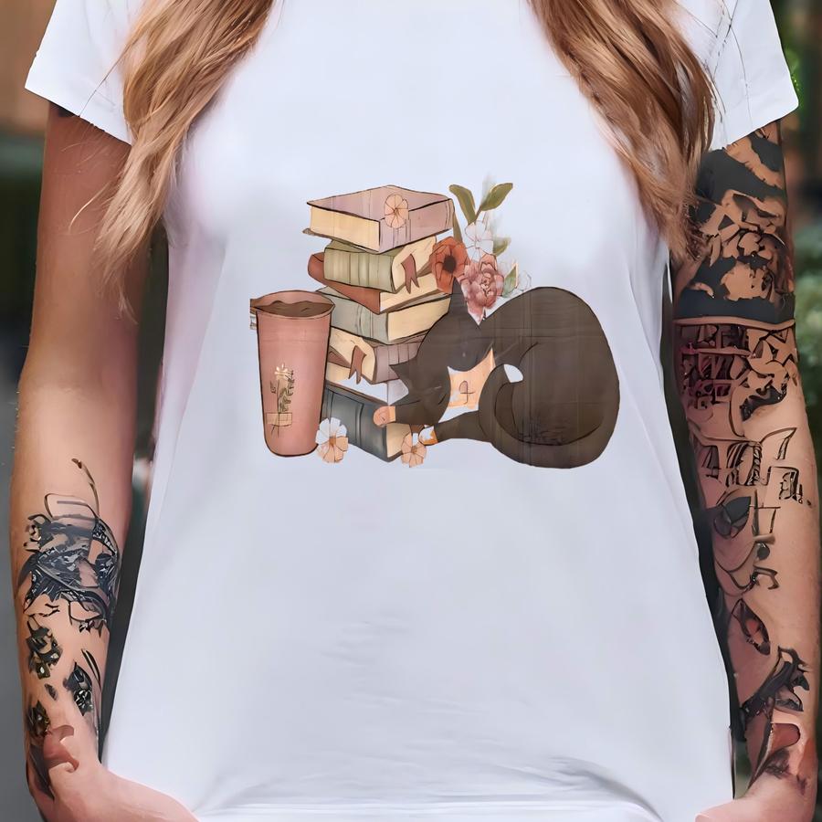 Cats Books Coffee Bleached Flannel Shirt Cozy Reading Graphic Rustic Bookworm Outfit Fall Style T-shirt