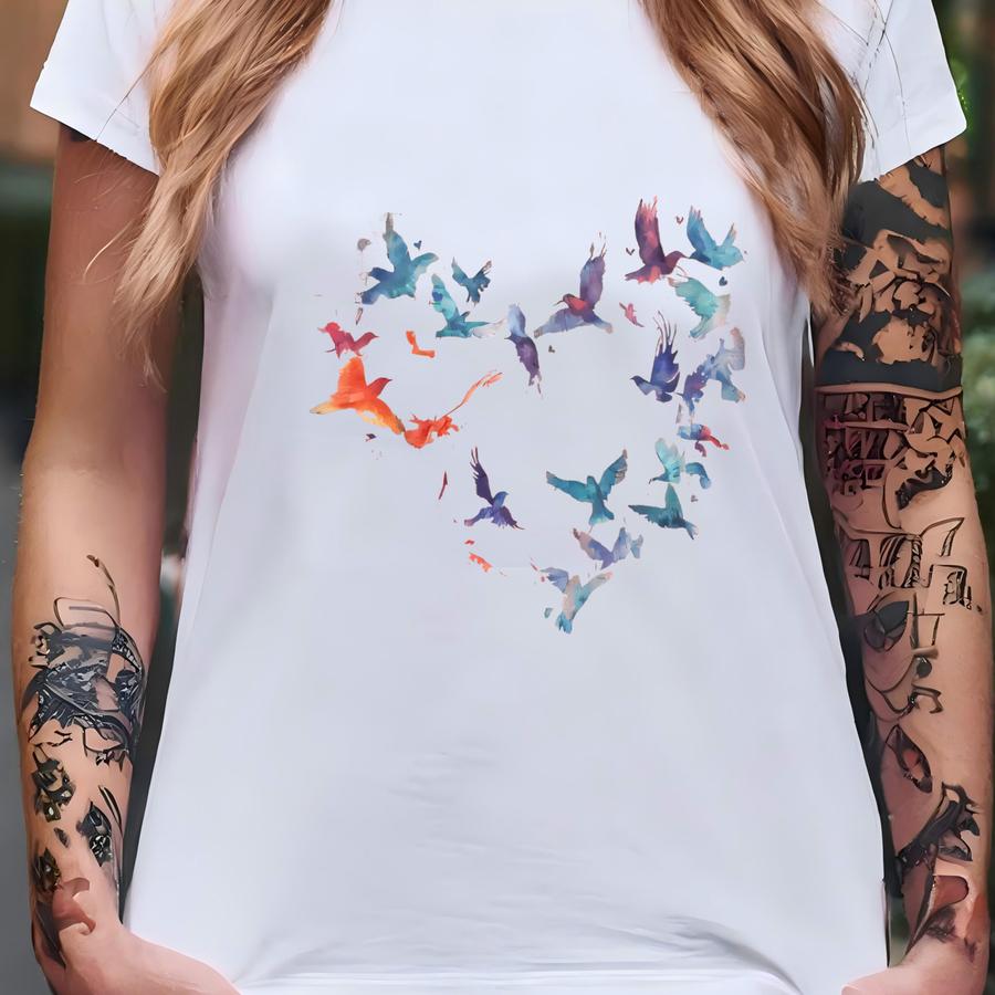 Bird Heart Bleached Flannel Shirt Colorful Flying Birds Graphic Whimsical Artistic Romantic Top T-shirt