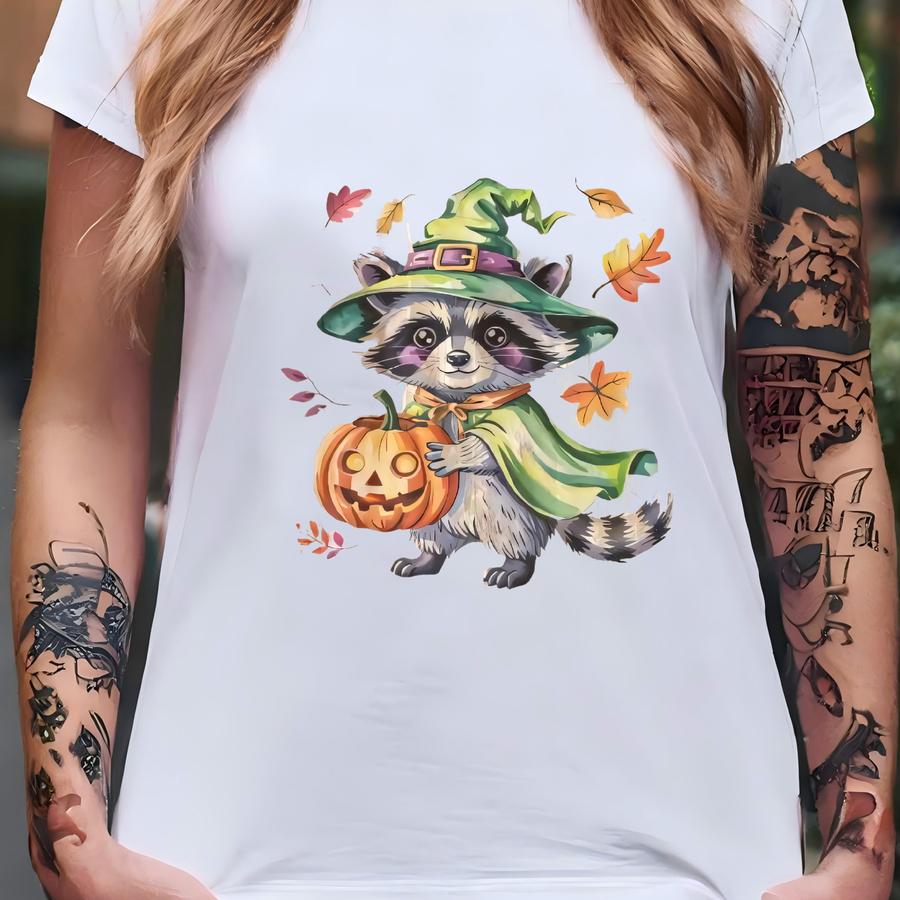 Bleached Flannel Shirt With Cute Raccoon Witch Holding Pumpkin Lantern Fall Leaves Halloween Cozy Top T-shirt