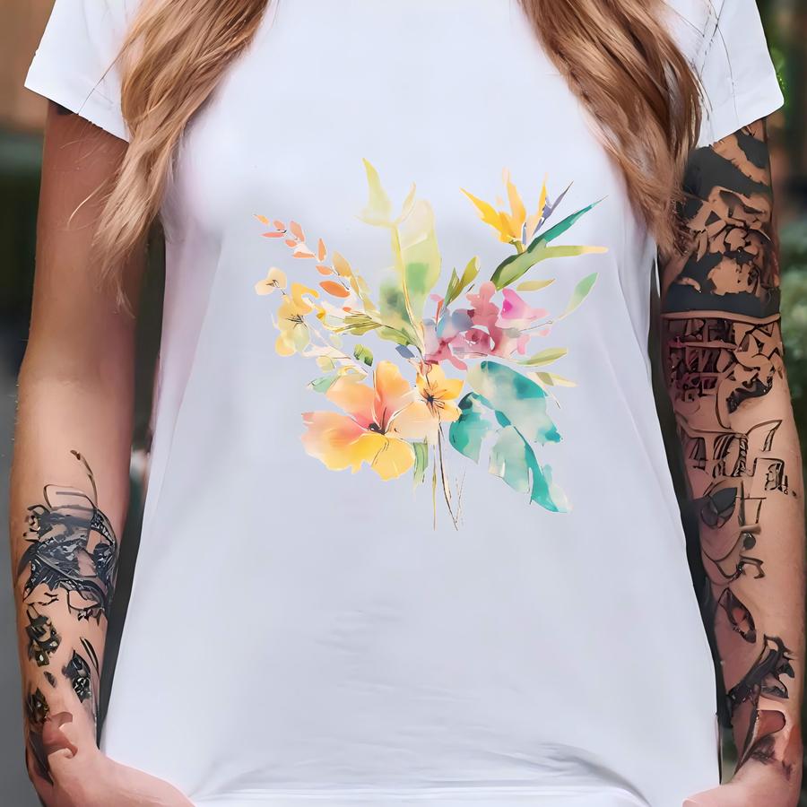 Watercolor Floral Print T Shirt Pastel Garden Flowers Botanical Art Shirt Hawaiian Hibiscus Bird Of Paradise Summer Graphic Tee Beach T-shirt