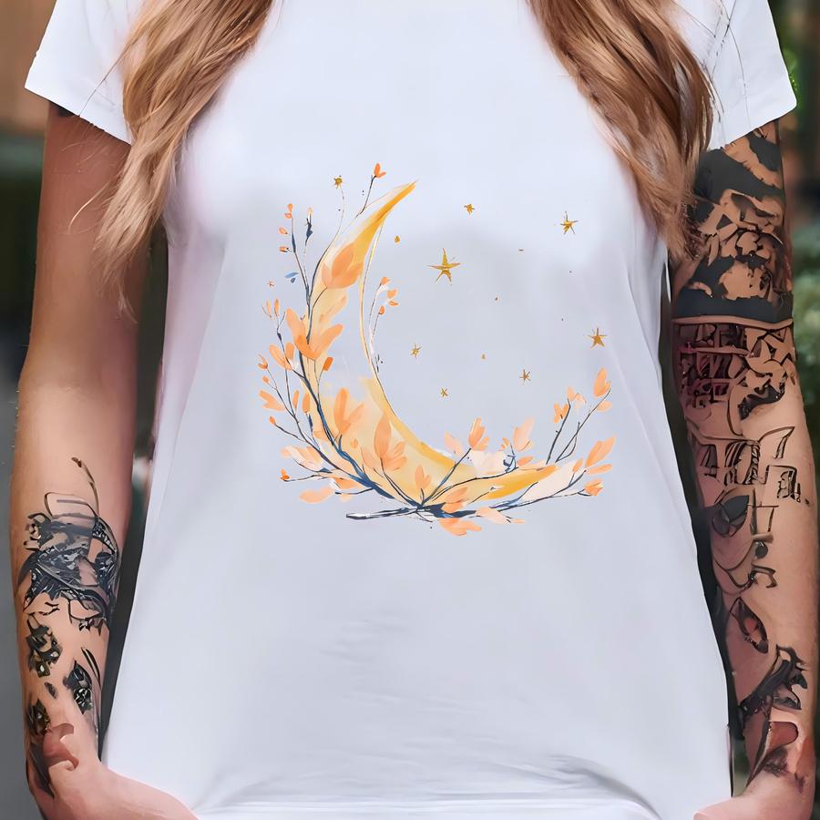 Crescent Moon And Fall Leaves Graphic Shirt Autumn Moon Nature Design Starry Sky Celestial Botanical T Shirt Natural Cream Moon Tee T-shirt