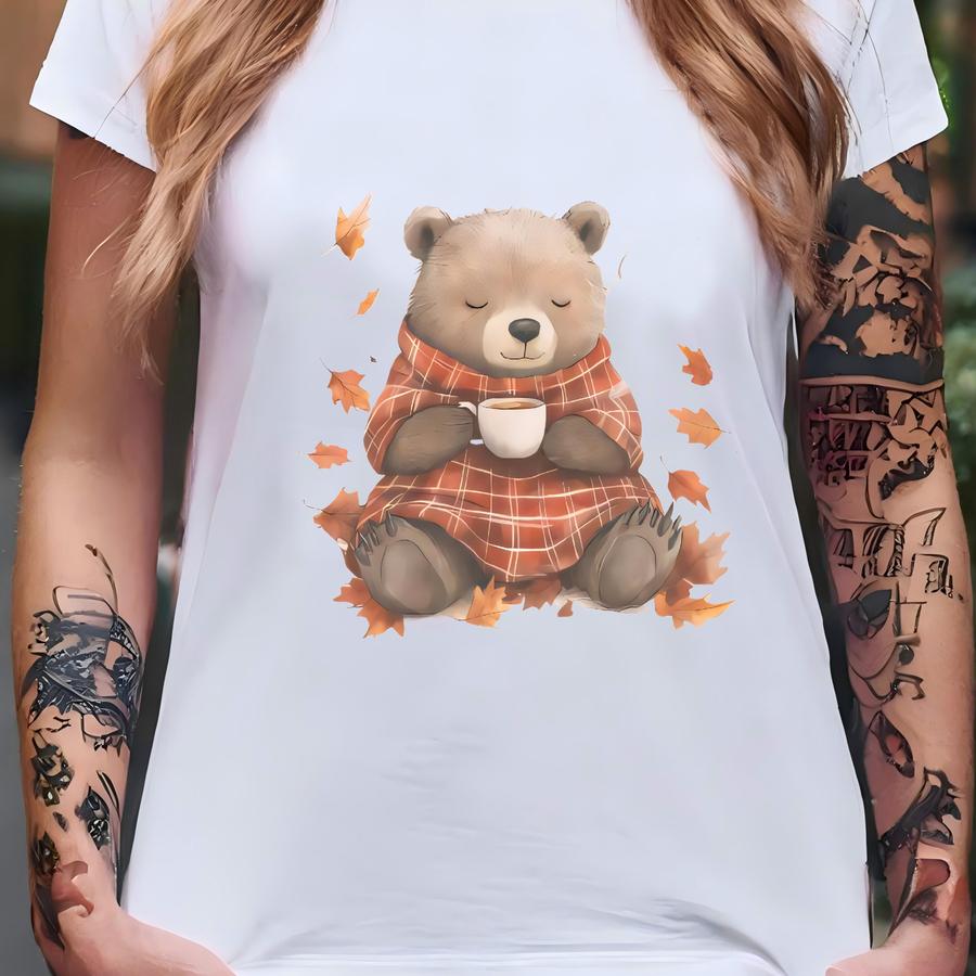 Cute Bear Drinking Coffee Fall Leaves Shirt Cozy Autumn Animal Graphic Tee Cream Color Comfort Soft Cotton Shirt Bear Art Shirt Gift T-shirt