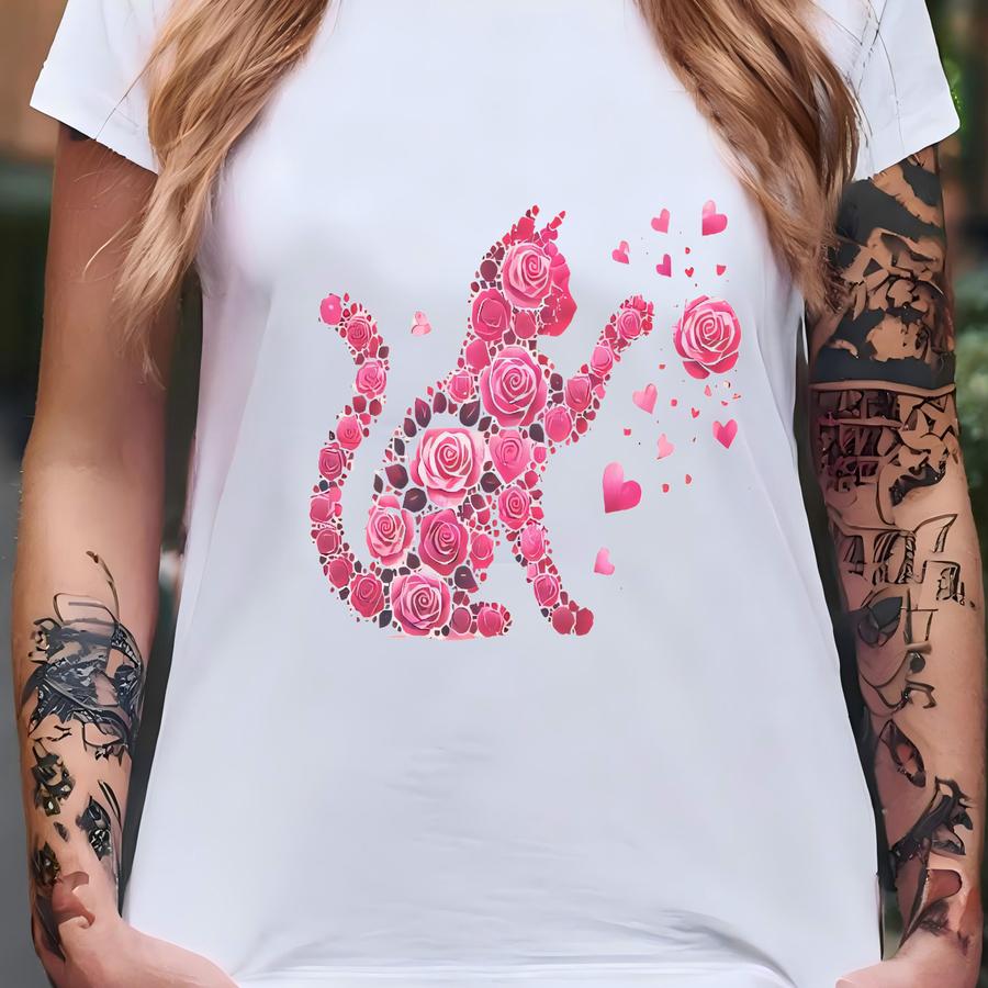 Rose Cat T Shirt Pink Floral Cat Lover Tee Cute Playful Kitty Graphic Shirt Romantic Flower Cat Art Top Gift For Women Men Cat Mom Dad T-shirt
