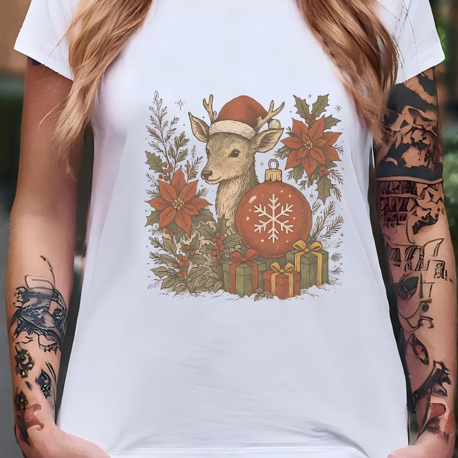 Christmas Deer Shirt Santa Hat Red Ornament Holiday Reindeer Shirt Poinsettia Holly Festive Floral Gifts Graphic Shirt Cozy Xmas Top T-shirt
