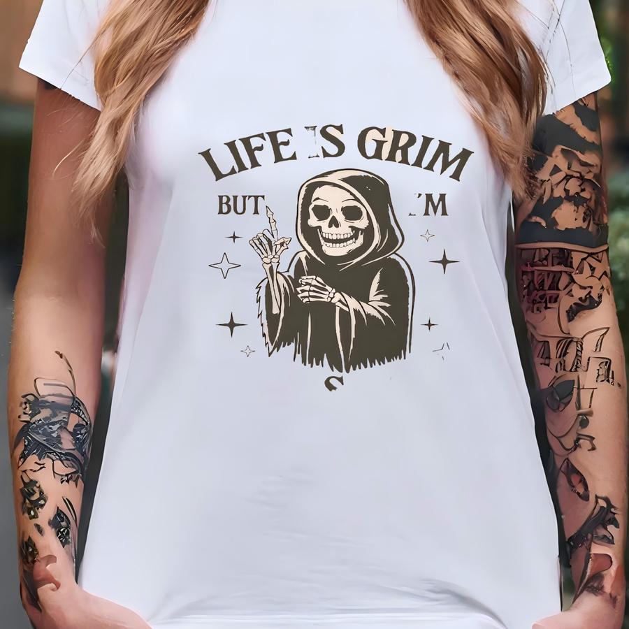 Grim Reaper Life Is Grim But I Am Still Smiling Skeleton Hoodie Graphic Long Sve Shirt Halloween Goth Alternative Humor Tee T-shirt