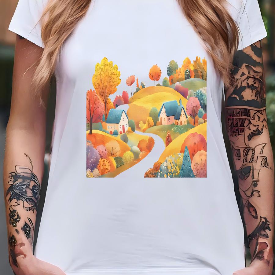 Autumn Hillside Cottage Art Long Sve Shirt Fall Landscape Painting Countryside Nature Graphic Tee Cozy Scenic Top Gift T-shirt