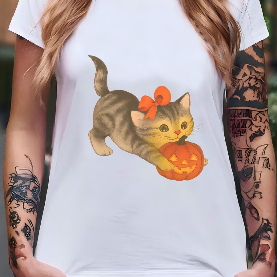 Cute Halloween Cat Shirt With Jack O Lantern Bow Playful Kitten Graphic Cozy Fall Holiday Sweatshirt Halloween Cat Lover Gift Tee T-shirt