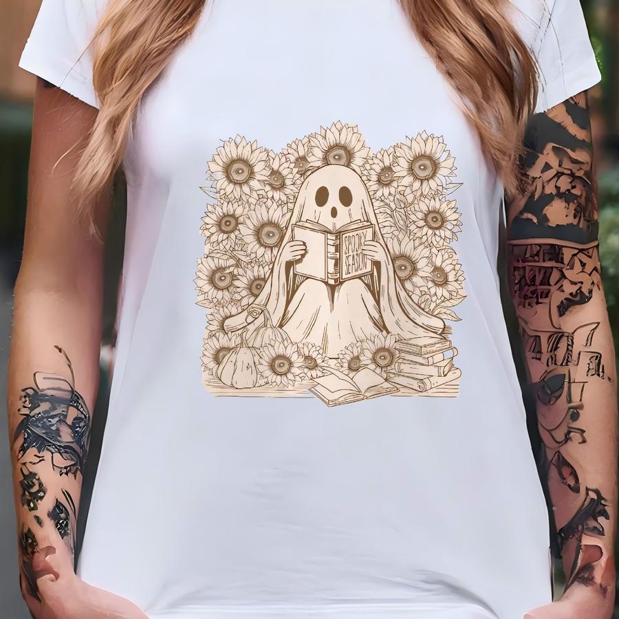 Ghost Reading Book Suower Shirt Spooky Season Pumpkin Aesthetic Graphic Long Sve Halloween Shirt Fall Cozy Book Lover Tee T-shirt