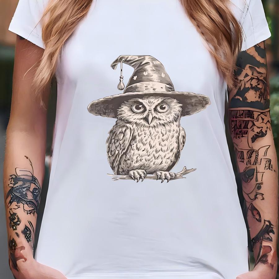 Wizard Owl Graphic Shirt Halloween Animal Lover Tee Cute Witch Hat Owl Drawing Fall Fashion Magic Bird Tshirt Casual Gift T-shirt