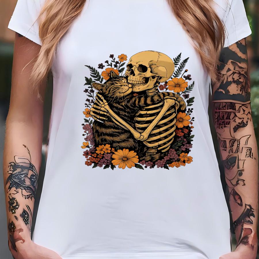 Skeleton Hugging Cat Floral Halloween Comfort Shirt, Cute Spooky Skeleton Cat Shirt, Cat Mom Gift, Halloween Gift, Halloween Floral Cat T-shirt