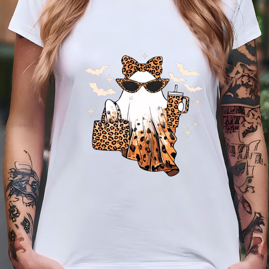 Ghost Sweatshirt, Leopard Ghost Tee, Ghost Coffee Shirt, Funny Fall Shirt, Ghost Tee, Girly Halloween Gift, Halloween Crewneck T-shirt