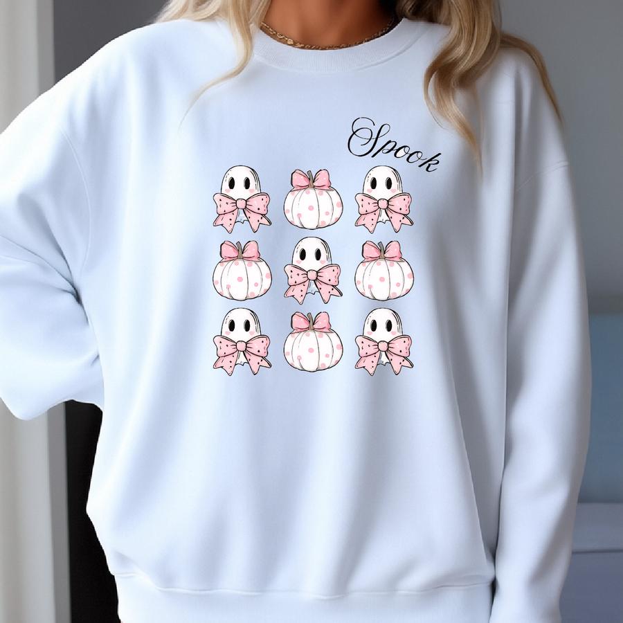Too Cute To Spook Shirt, Cute Spirit T-shirt, Pink Coquette Bow Hoodie, Sweet And Spooky Crewneck, Darling Pumpkin Outfit, Halloween Party Sweatshirt
