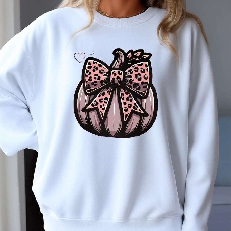 Coquette Pumpkin Sweatshirt | Leopard Bow Pumpkin Shirt | Pink Fall Aesthetic Tee | Cute Halloween Shirt | Spooky Season Crewneck Sweatshirt