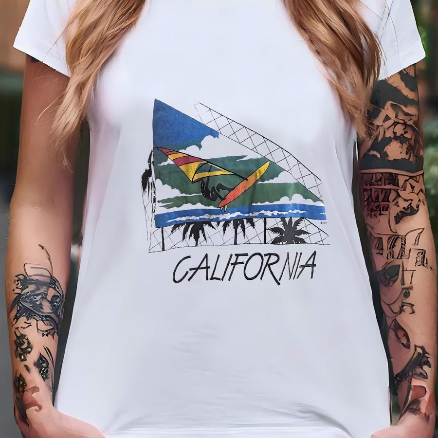 Vintage 80s California Windsurfing White Crop Top Ringer T Shirt Modeled Size M T-shirt